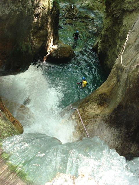 El primer obstáculo nos hace saltar a una poza previa a un rápel o tobogan. Valorar según el caudal puesto que a partir del color rojo hay un rebufo.